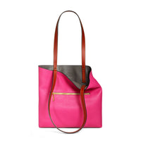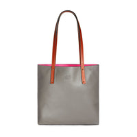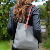 The Reversible Kent Leather Shopper Bag has quickly become our most popular product. This simple yet stylish and versatile bag is handmade using soft Italian cowhide leather in grey and pink for the main body and classic Northampton naturally tanned brown leather for the slim but sturdy and practical handles, which are long enough to comfortably fit over the shoulder on top of a coat.