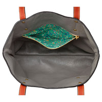 This grey and pink leather tote bag is spacious, slouchy, and easy to wear, making it the perfect everyday bag. It can be easily turned inside out and worn with the alternative colour combination. There is a zip pocket on the inside for holding your phone, keys, wallet, and other small essentials. The pocket has a cotton fabric lining with a bold floral Liberty design and high-quality Italian gold-tone zip. The brand logo is blind embossed at the front of the bag.