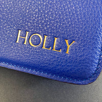 Letters are 8mm high (all capitals) and will be embossed in gold or blind (no colour) at the front right bottom corner. The maximum number of letters available, including spaces, numbers and special characters like dash, full stop and back slash, is seven.