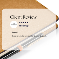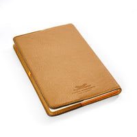We love this leather, its beautiful texture and neutral tan colour. It is durable and luxuriously soft to touch. The brand logo is embossed on the back. The leather covers are available in seventeen colours.