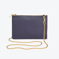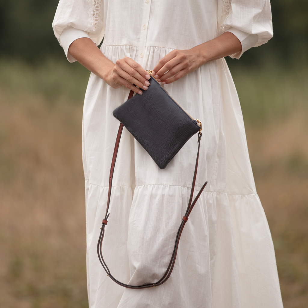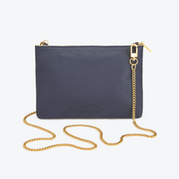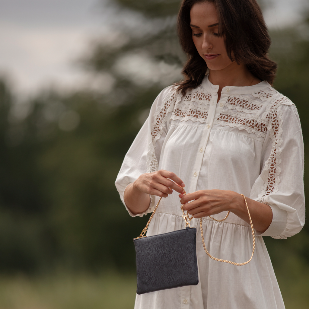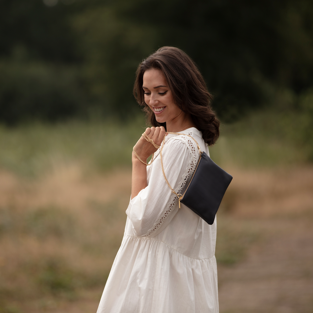 Its clean, structured silhouette is softened by a delicate contrast Liberty floral cotton lining, adding a vibrant touch of colour and character. The design is elevated with a polished gold-toned zip and a detachable gold chain strap that lends a refined, jewellery-like accent—perfect for evenings—while an optional adjustable leather strap transforms it into a more relaxed, everyday crossbody.