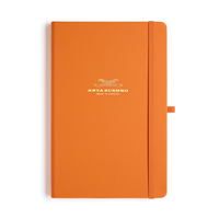 The orange hardback refill notepad comes with matching elastic pen holder and ribbon bookmark and an additional back pocket to keep all your business cards and notes in order. Our brand logo is embossed in gold at the front. Each has 80 sheets (160 sides) of lined paper and is 80g in weight.
