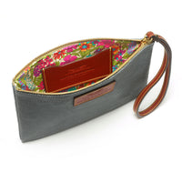 Stylishly simple wristlet, handmade in printed grey textured, Italian leather that will never go out of fashion. An attractive floral Liberty cotton lining and gold-toned metal zip add to this accessory’s understated elegance. Incorporated inside the leather wristlet is a handy card pocket in brown cowhide leather.