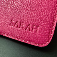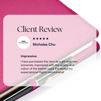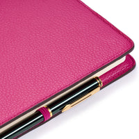We love this leather, its beautiful texture and stylish pink colour. It is durable and luxuriously soft to touch. The brand logo is embossed on the back. The leather covers are available in seventeen colours.