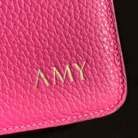 Letters are 8mm high (all capitals) and will be embossed in gold or blind (no colour) at the front right bottom corner. The maximum number of letters available, including spaces, numbers and special characters like dash, full stop and back slash, is eight.