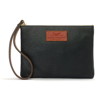 The brand logo appears on the front cover of the wristlet purse on a stylishly embossed naturally tanned cowhide leather stamp, which is finished with a yellow stitching detail.