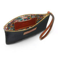 Stylishly simple wristlet, handmade in black textured, Italian leather that will never go out of fashion.  An attractive floral Liberty cotton lining and gold-toned metal zip add to this accessory’s understated elegance.  Incorporated inside the leather wristlet is a handy card pocket in brown cowhide leather.