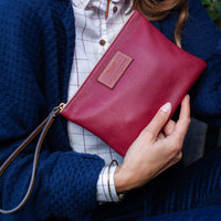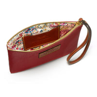 Stylishly simple wristlet, handmade in burgundy textured, Italian leather that will never go out of fashion.  An attractive floral Liberty cotton lining and gold-toned metal zip add to this accessory’s understated elegance.  Incorporated inside the leather wristlet is a handy card pocket in brown cowhide leather.