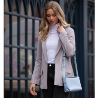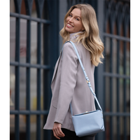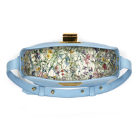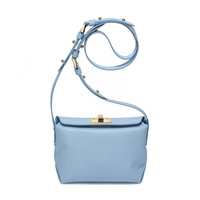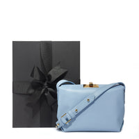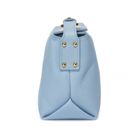 The minimalist design of the main body allows the sleek Saffiano Italian leather to take centre stage with the Art-Deco gold-tone lock providing a dazzling effect against the light blue leather.