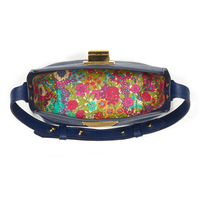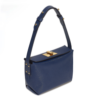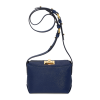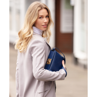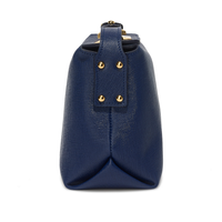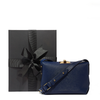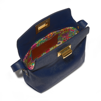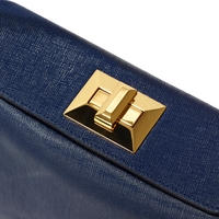 The minimalist design of the main body allows the sleek Saffiano Italian leather to take centre stage with the Art-Deco gold-tone lock providing a dazzling effect against the navy leather.