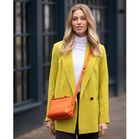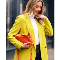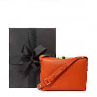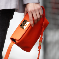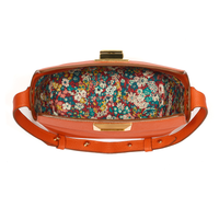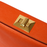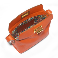 The minimalist design of the main body allows the sleek Saffiano Italian leather to take centre stage with the Art-Deco gold-tone lock providing a dazzling effect against the orange leather.