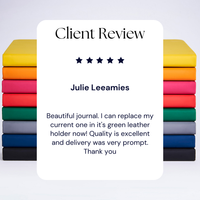 Each A5 hardback notebook is a refill pad for our made-to-order A5 personalised luxury leather notepad cover. If you love your textured green A5 leather notebook, but have run out of pages, then this green refill is what you need. You can either use it with your matching leather cover or just on its own, because it is awesome as it is. Thanks to its stylish finish and hard cover, it will look great on your desk or in a meeting and will fit snugly inside your bag.