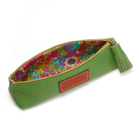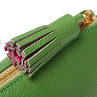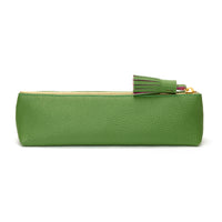 Chic and stylish personalised pencil case in textured green leather with matching double-coloured tassel in green and pink, finished with a stitch.