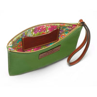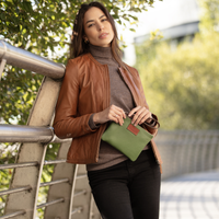 Stylishly simple wristlet, handmade in green textured, Italian leather that will never go out of fashion.  An attractive floral Liberty cotton lining and gold-toned metal zip add to this accessory’s understated elegance.  Incorporated inside the leather wristlet is a handy card pocket in brown cowhide leather.
