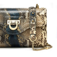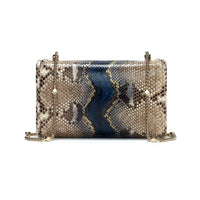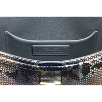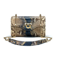 The beautiful gold chain bag strap can sit comfortably on the shoulder or across the body. The strap is adjustable, with the python leather pieces joined to the chain with gold-coloured D-rings. This snake skin hand bag will easily accommodate a small wallet, keys, mobile phone and cosmetics.