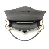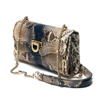 The Lady Severina python shoulder bag is part of our luxury collection. Handcrafted in hand-painted blue Camelot python leather, it is a dazzling and eye-catching accessory, perfect for any occasion day or night. The leather features a combination of gold, blue and cream colours, mixed with shades of brown, creating a glimmering effect.