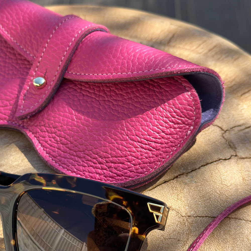 Bright, bold, and beautifully unexpected — our newest sunglasses case combines the playful energy of fuchsia pink Italian full-grain leather with the rich depth of purple goat suede lining. Handmade in our Kent atelier, this piece is a celebration of craftsmanship, creativity, and thoughtful design.