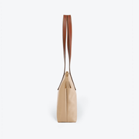 This simple yet stylish and versatile tote bag is handmade in London using soft Italian cowhide leather in cream for the main body and classic Northampton naturally tanned brown leather for the slim but sturdy and practical handles, which are long enough to comfortably fit over the shoulder on top of a coat.