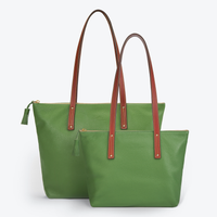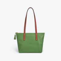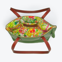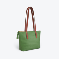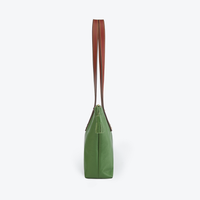 This simple yet stylish and versatile tote bag is handmade in London using soft Italian cowhide leather in green for the main body and classic Northampton naturally tanned brown leather for the slim but sturdy and practical handles, which are long enough to comfortably fit over the shoulder on top of a coat.