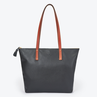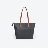 This simple yet stylish and versatile tote bag is handmade in London using soft Italian cowhide leather in black for the main body and classic Northampton naturally tanned brown leather for the slim but sturdy and practical handles, which are long enough to comfortably fit over the shoulder on top of a coat.
