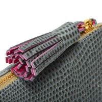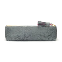 Chic and stylish personalised pencil case in textured printed grey leather with matching double-coloured tassel in printed grey and pink, finished with a stitch.