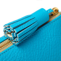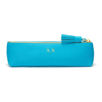 Chic and stylish personalised pencil case in textured Turquoise leather with matching double-coloured tassel in Turquoise and ivory, finished with a stitch.