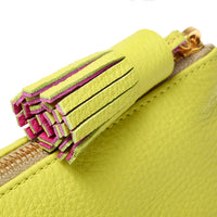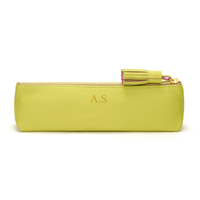 Chic and stylish personalised pencil case in textured yellow leather with matching double-coloured tassel in Turquoise and ivory, finished with a stitch.